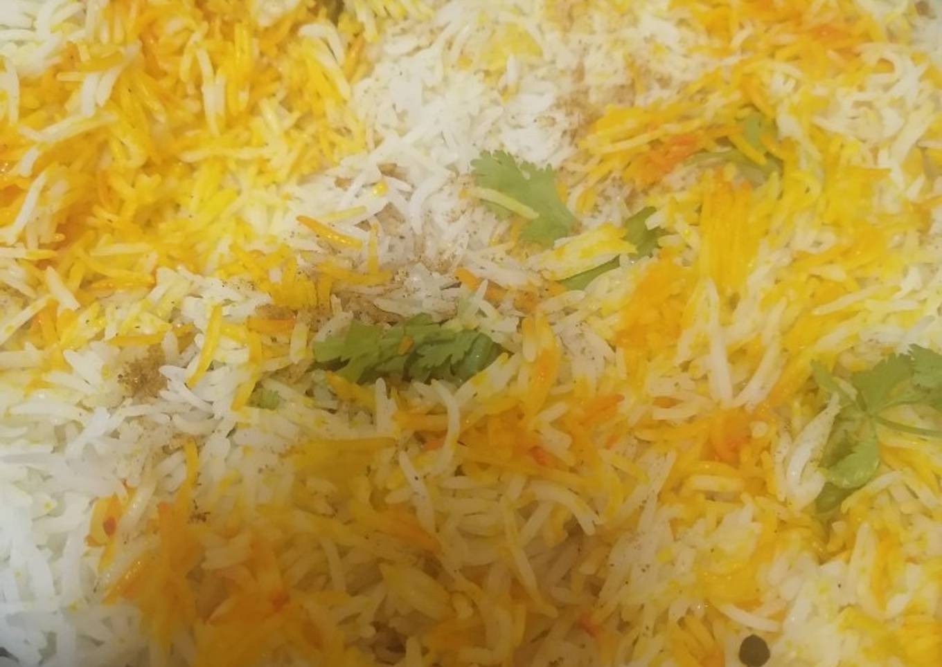 - Now garnish it with green coriander and chilies and few drops of kewra water mixed with color. Spread on top of rice. Then simmer it for 3 minutes.