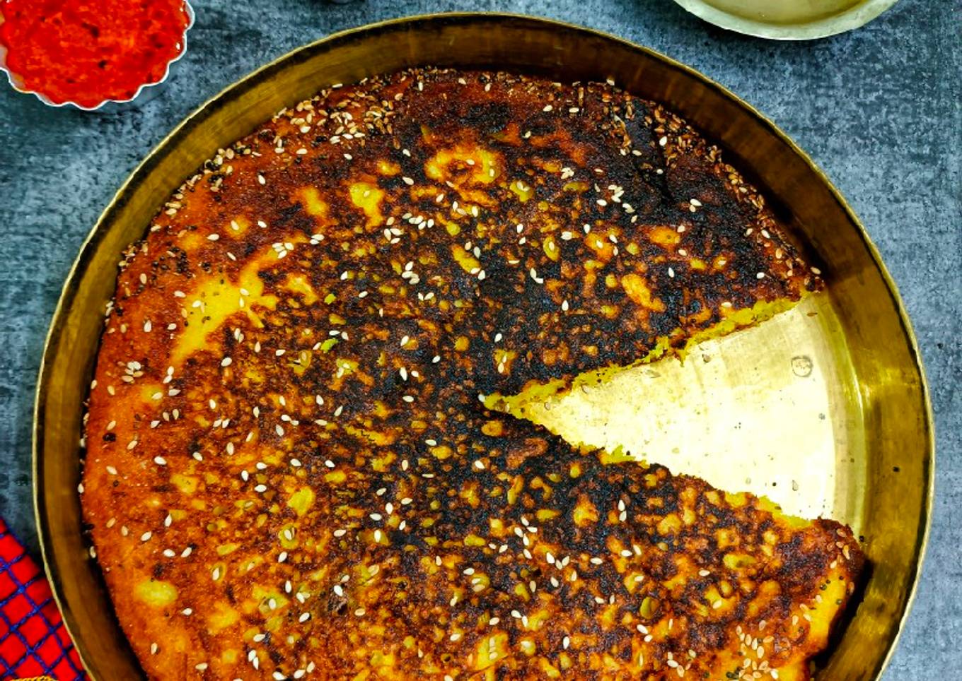- In a non-stick pan, heat oil and add cinnamon, cloves and dry red chilli. Now add mustard seeds and let it crackle. Add carom seeds hing and sesame seeds to it. Add the prepared batter and level it. Now cover and cook it on high to medium heat for 5 to 7 minutes. When there is a brown crust on one side add a little bit of oil on the top side and turn it over.