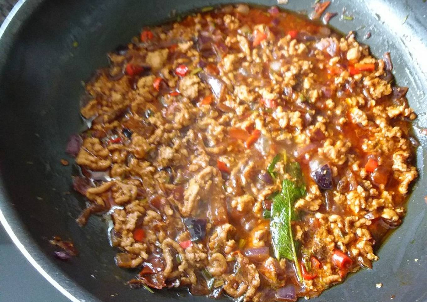- Slice the onions finely, chop the tomatoes roughly, Heat oil in a wok add the onions, stir fry for 3' then add garlic, ginger, Cardamom, Green chilis & the meat, salt black pepper, mix well all together and cook for 3'. Then add the Lemon grass stalk, kaffir-lime leaves the Kasuri methi (see image) and continue to stir fry for further 4'. Now reduce the heat to low,put on the lid & cook on low heat for 3' till the meat are a little bit softened.Open the lid and give a stir.