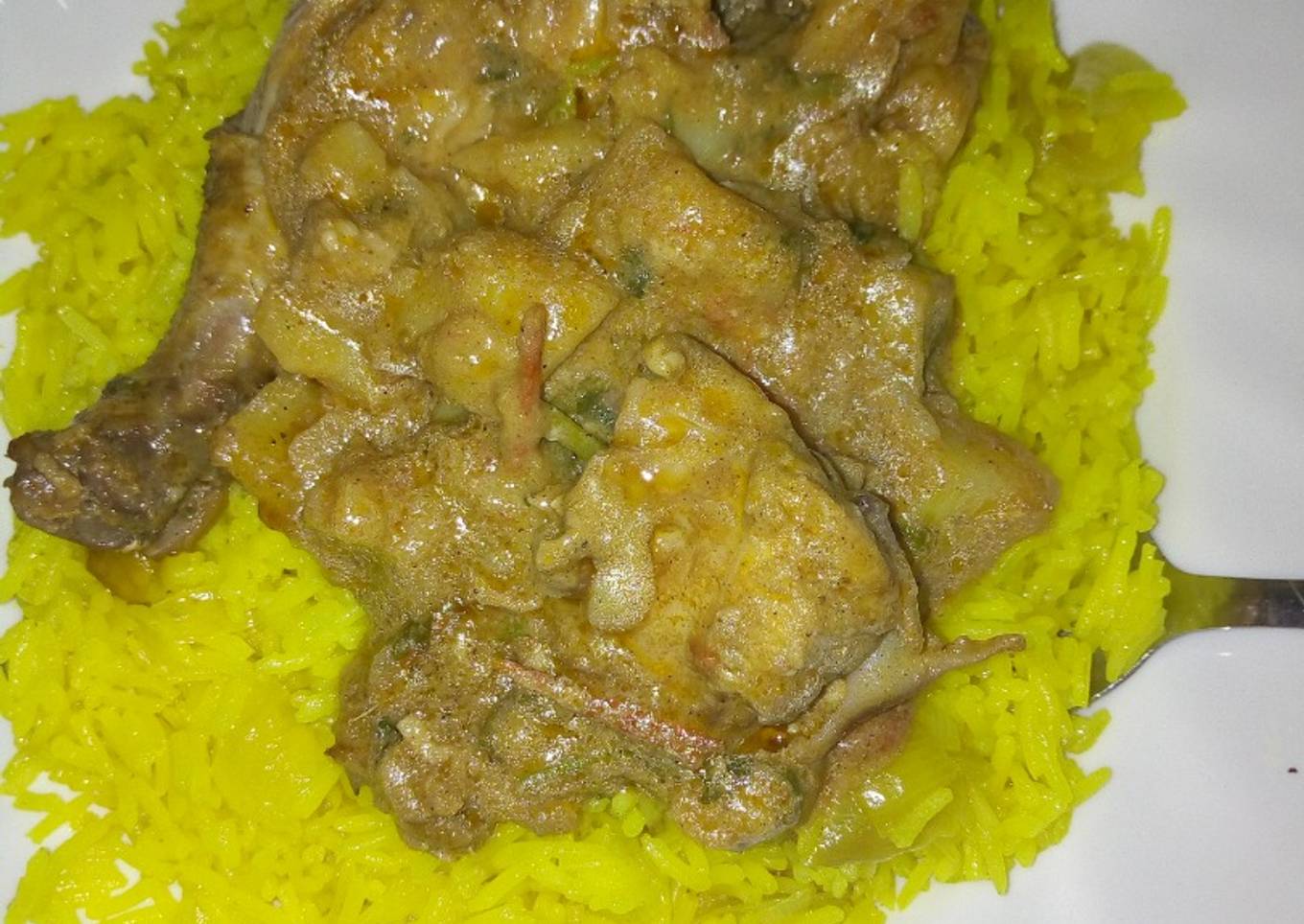 - Add the fried onion and potatoes to the chicken..add salt let it simmer for a few more minutes.then serve.