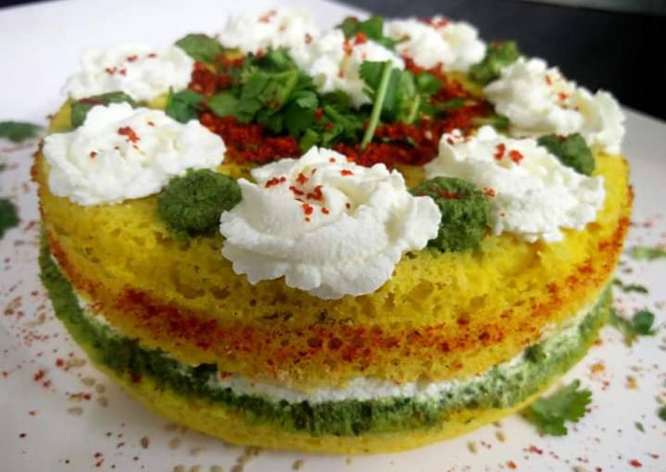 - Assemble one plate yellow colour on it spread green chutney layer of curd again yellow colour Dhokla sprinkle red chilli powder and tempering of mustard seeds and sesame seeds garnish with hung curd coriander leaves and fresh coconut flakes.